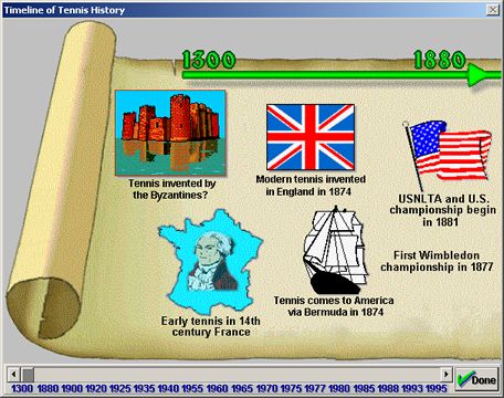 a tennis trivia game, a timeline of tennis history, and reference